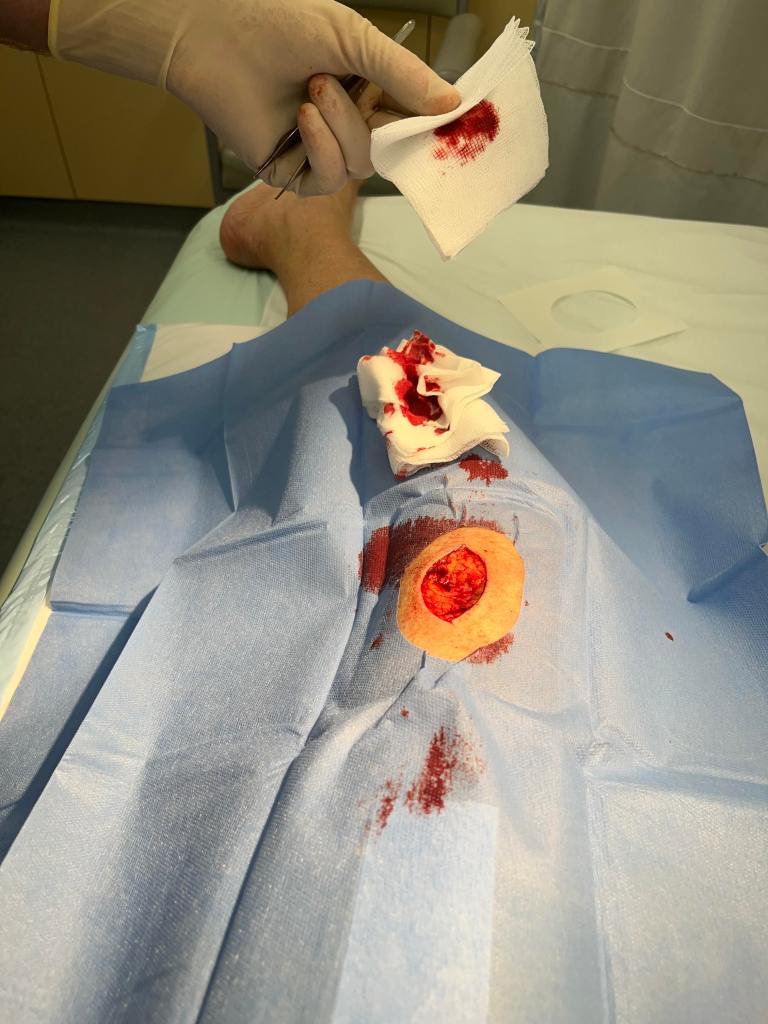 During this surgical recovery I would often walk to work. My work bag was a cross body bag and I noticed one day it was causing a sore spot on my left leg. It looked like cyst, which I figured, was caused by the rubbing of the edge of the bag. I adjusted the length of the bag, so it would sit a bit higher, but the ‘cyst’ didn’t go away. After a month or so I made an appointment with the GP to get it looked at. I’m going to call my GP Tom (for the record, this is not their name, but I haven’t worked with any Docs called Tom, so in the spirit of confidentiality and good writing, Tom it is). Tom suggested it didn’t feel like a cyst, but we should make an appointment to excise it. This was November 16, 2022.