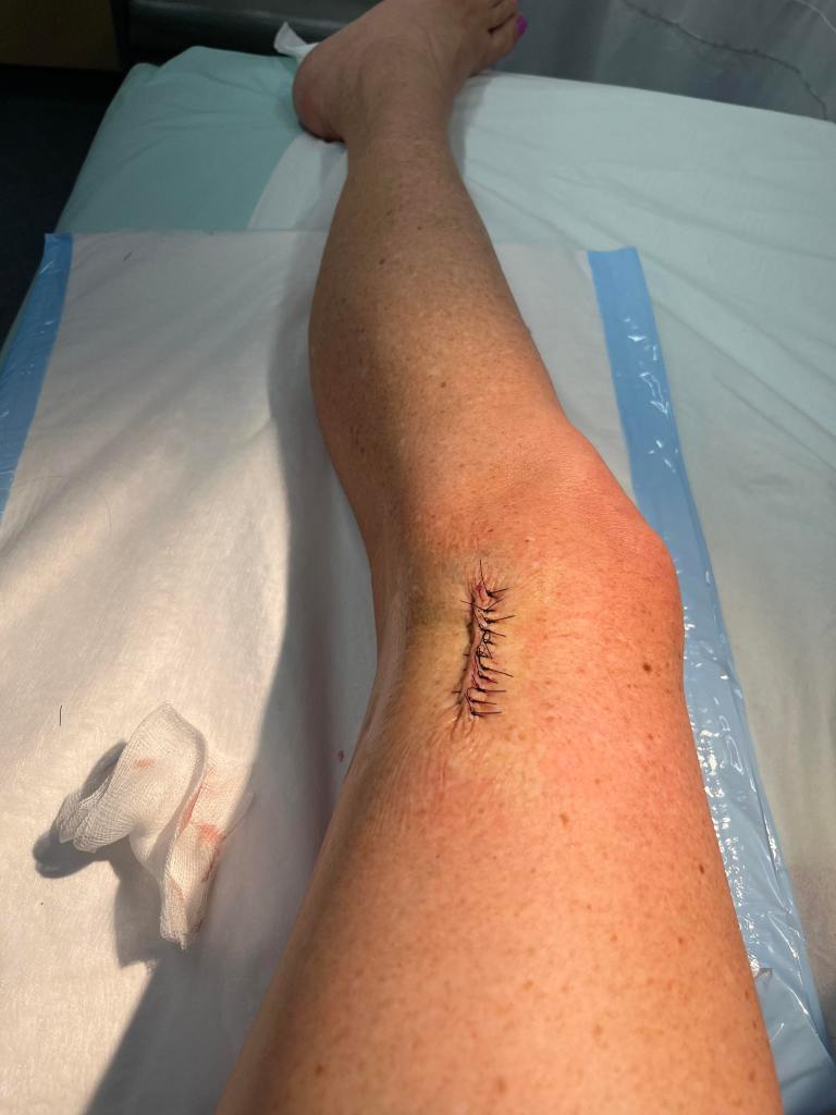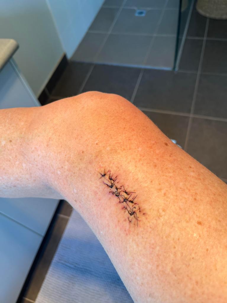 A very sombre looking Tom comes to get us and takes us to his office where he gives us the news: the lump was a melanoma and it’s not the primary. I say, “Ok, what’s the plan” – referral to Peter Mac is the plan – PET scan and MRI in the next week. Yikes, I’m now a patient who is getting a rapid referral. He then takes out my sutures. In my defence, I was going to suggest taking out every second suture due to the high flex area (and my huge quads…) but forget in the numbness of the situation. Sutures are out and we then go on to a full skin/lymph node check. Whilst moving from front to back, I feel my wound dehisce (open). There are no obvious primary moles/lesions nor are any of my lymph nodes enlarged. Rod and I are put in a quiet room, with paper cups of water (although I’d requested a margarita) and we sit there in disbelief. I head back for more sutures.