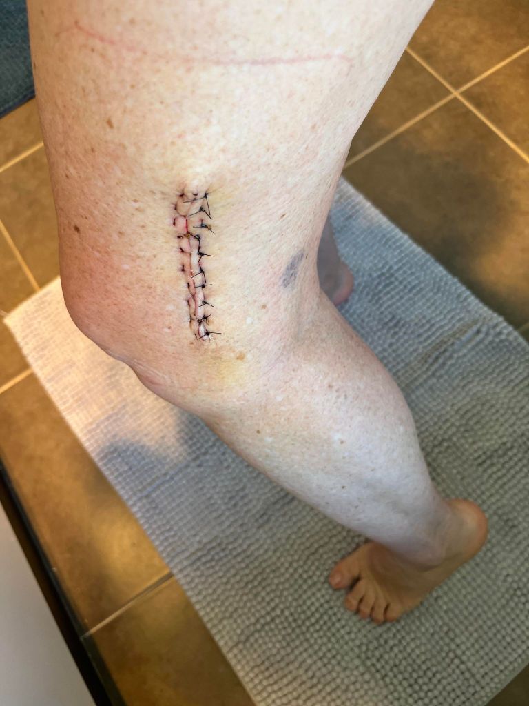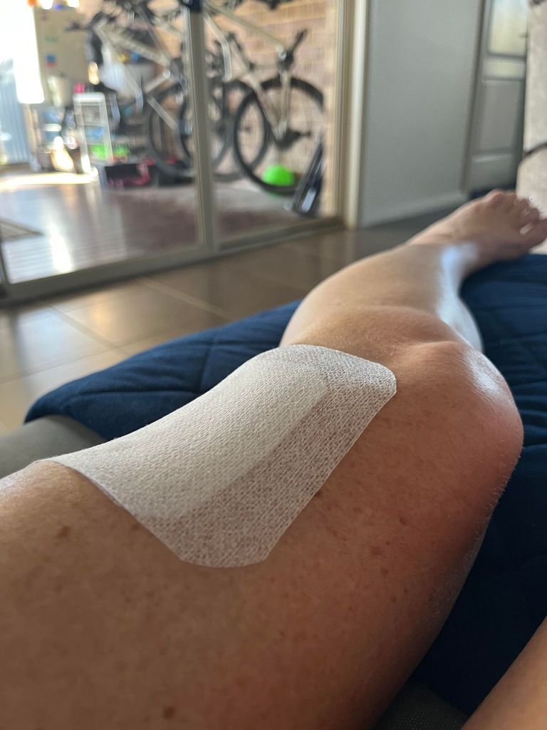 Pics of current sutures FYI – I changed the dressing this week. Yes it’s huge, yes, there’s a big dip in my leg, no I’m not worried about how it looks, yes a few more weeks until sutures are out and I’m back on the bike, yes I’m back at work, yes I was tired after just two days…